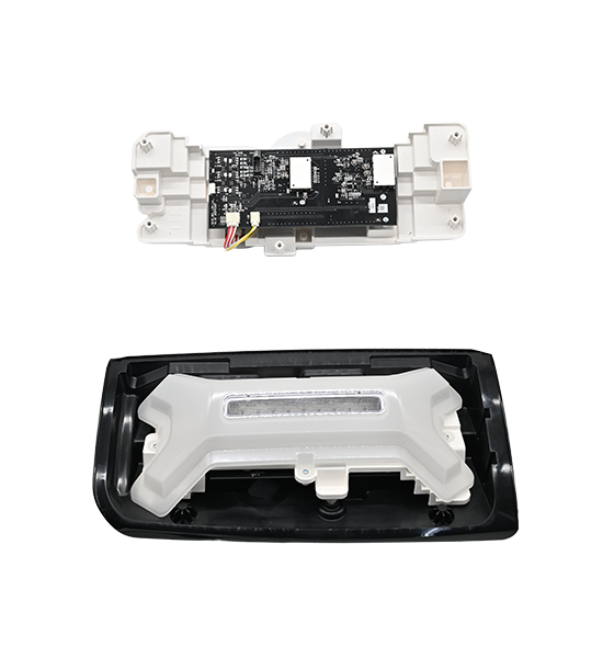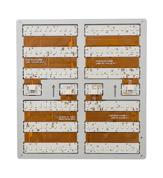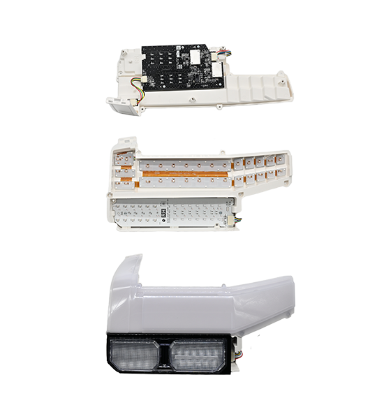 KGM O100(무쏘 EV) 차량의 리어 램프에 적용되는 LED 광원 모듈로 , SMT 표면 실장부터 램프 서브 어셈블리까지 자체 라인에서 일괄 생산합니다.